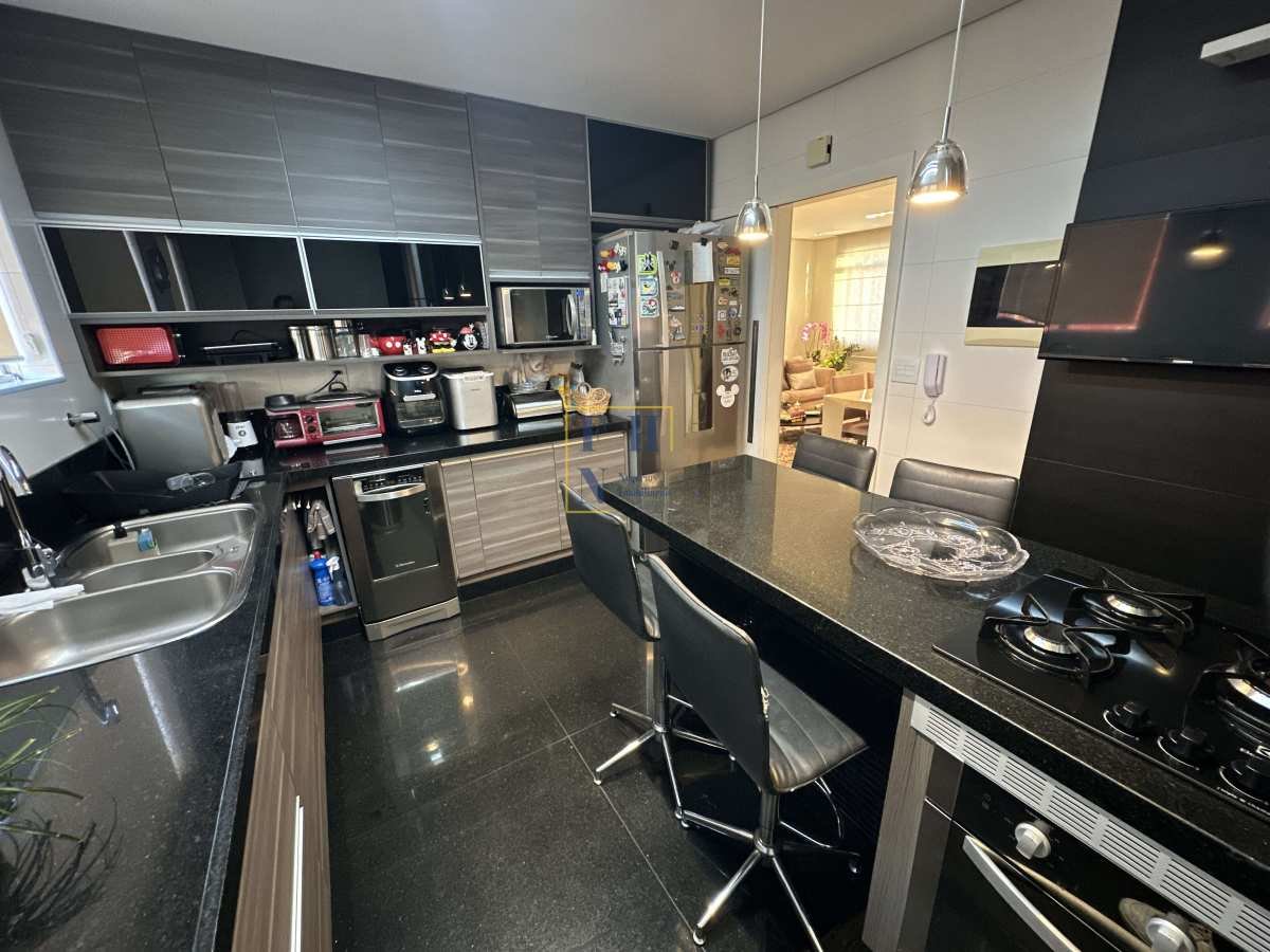 A cozinha é moderna, funcional e equipada com bancada em granito, marcenaria sob medida, forno elétrico embutido, coifa em inox e uma bancada ideal para refeições rápidas.