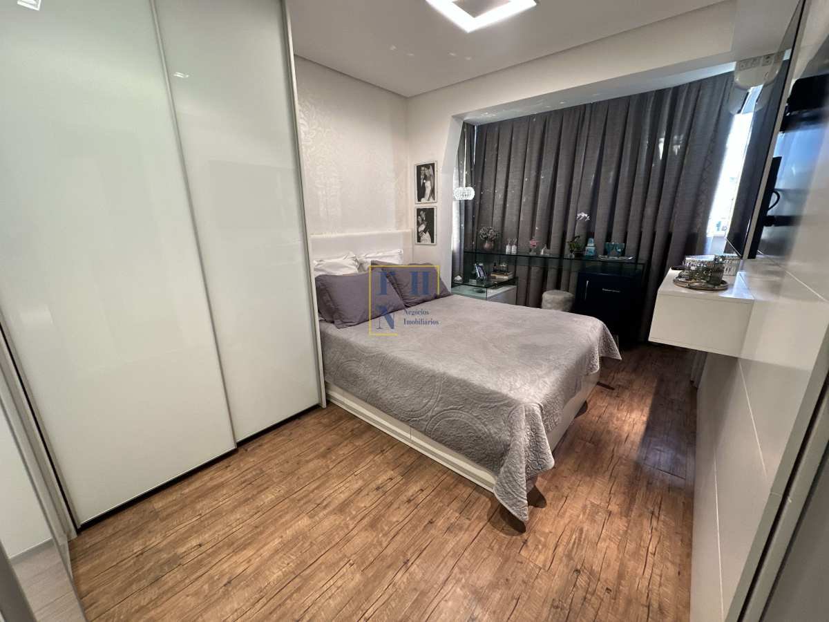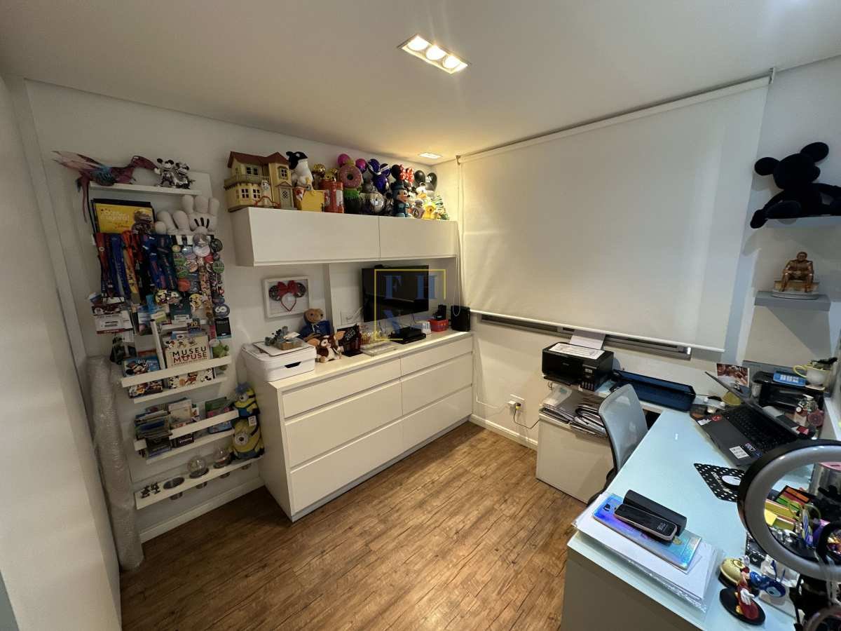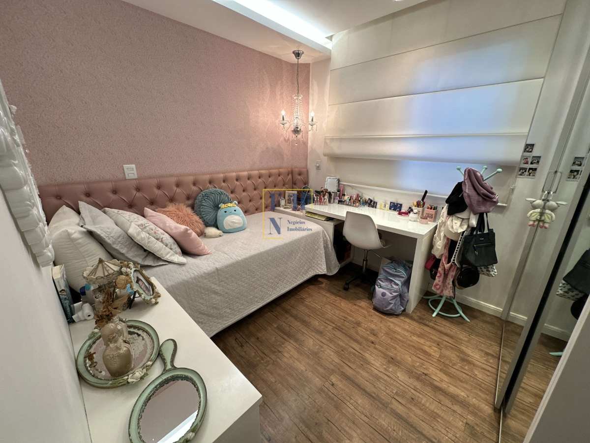 Na área íntima estão três quartos com armários planejados e piso vinílico amadeirado. A suíte principal conta com amplo armário, varanda integrada, ar-condicionado e um banheiro com fino acabamento: bancada em granito, cuba sobreposta, armário planejado e box em blindex.